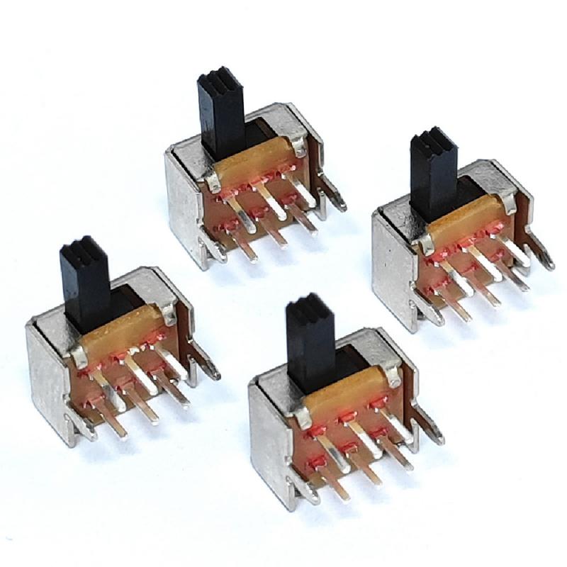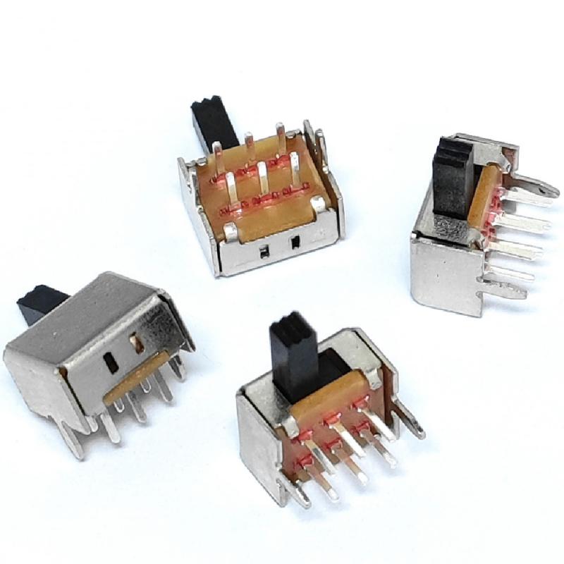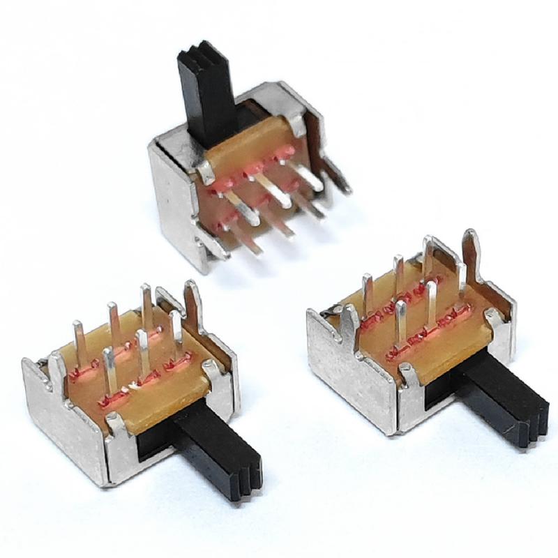 ON-ON DPDT スライド スイッチは、2 つの独立した回路を同時に制御し、2 つの安定した導通状態を切り替えることができる 2 極双投スライド スイッチであり、モーターの正逆回転や信号ルーティングなどのさまざまなシナリオに適しています。